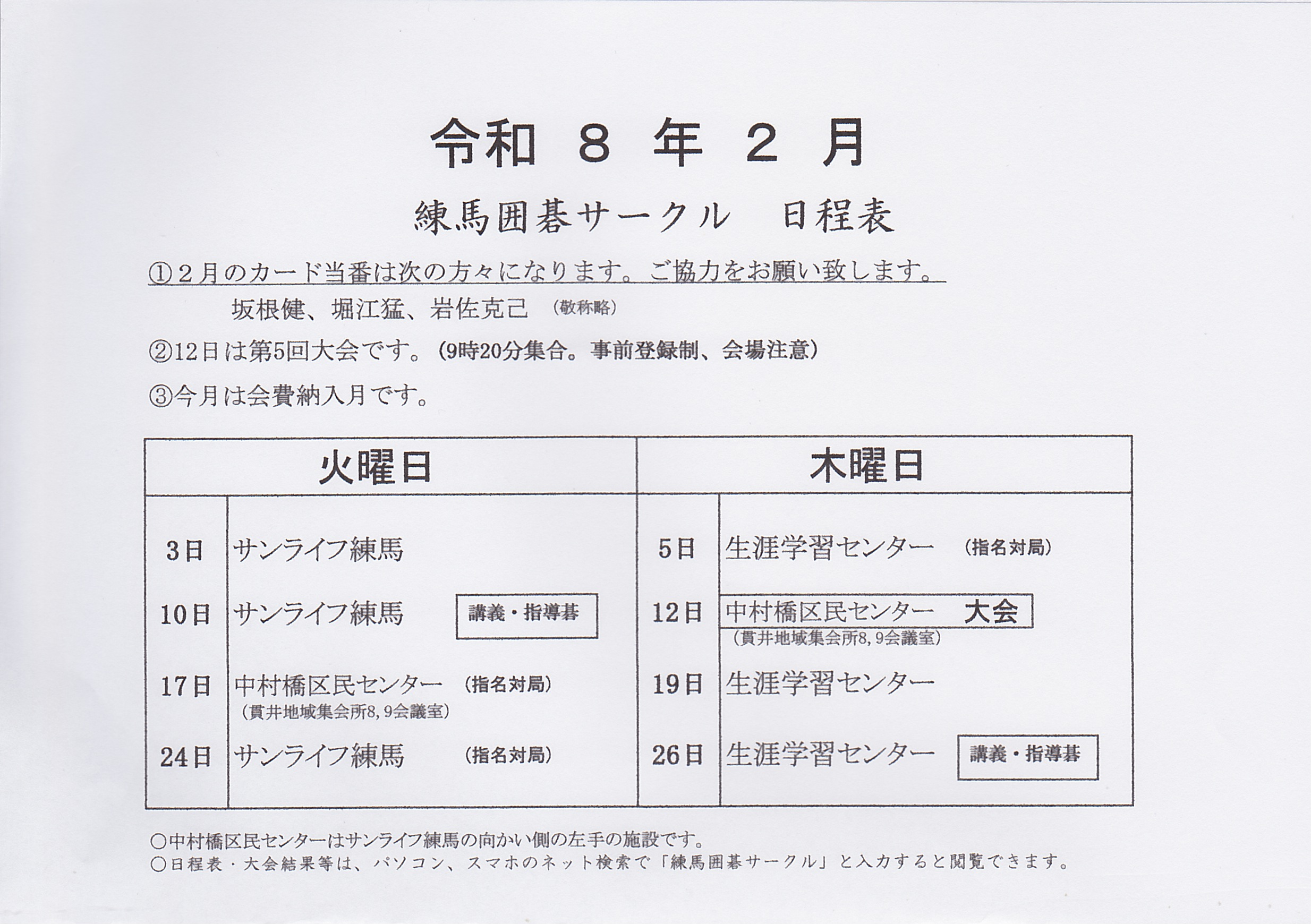 日程表の注意事項 1月8日(木)はサンライフ練馬で新年会です。1月15日(木)と1月27日(火)は中村橋区民センター(貫井地域集会所)です。(サンライフ練馬の向かい側施設) なお、2月日程表は幹事長承認前の仮掲載となります。 (注意事項)対局後の碁盤は各自が収納してください。