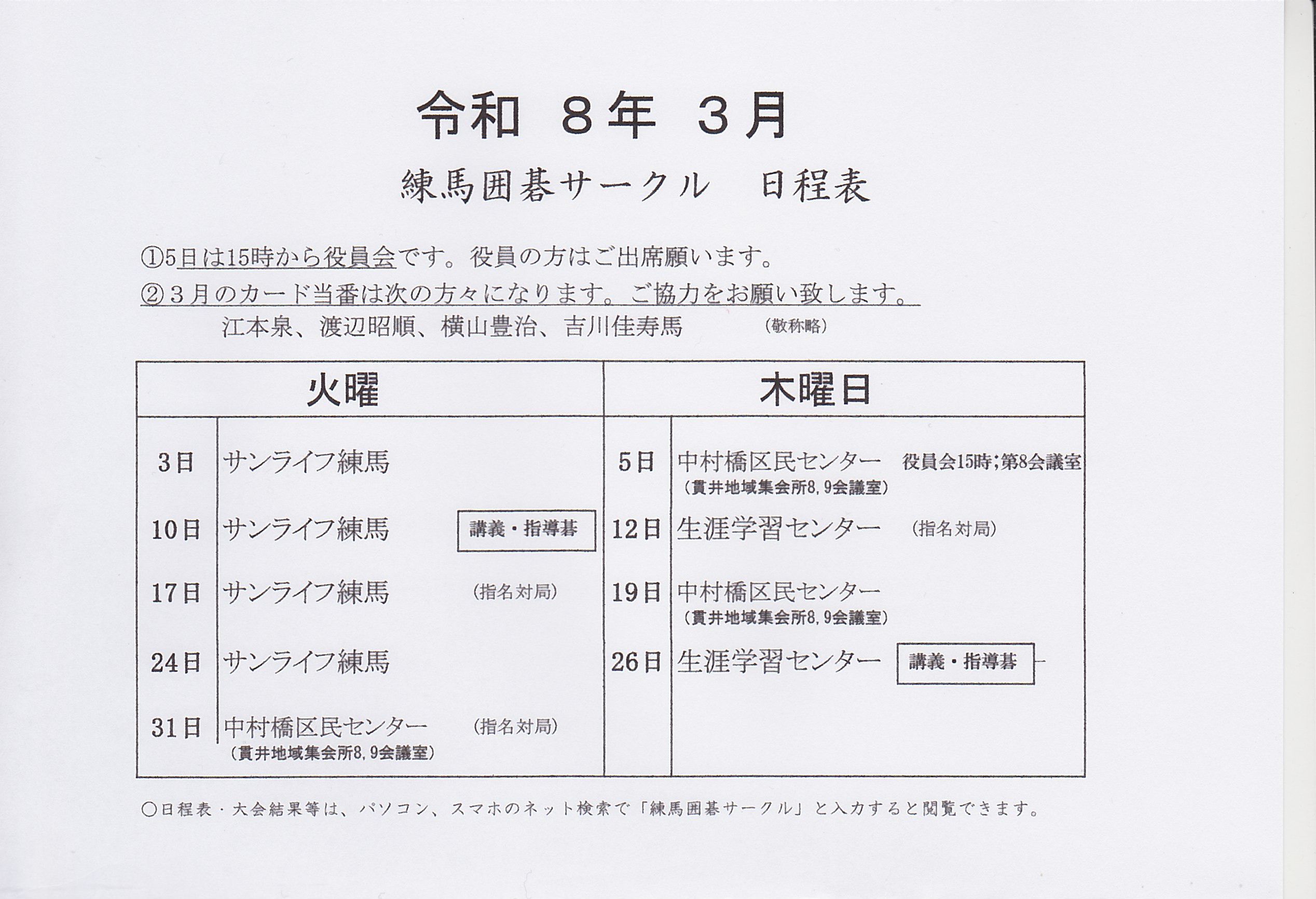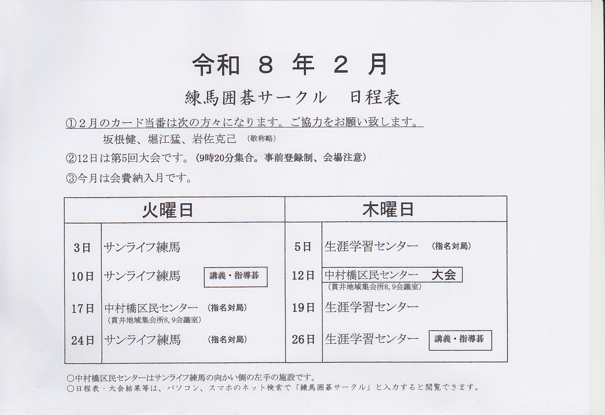 日程表の注意事項 2月12日(木)囲碁大会と2月17日(火)は中村橋区民センター(貫井地域集会所8,9会議室)です。(サンライフ練馬の向かい側施設) (注意事項)対局後の碁盤は各自が収納してください。