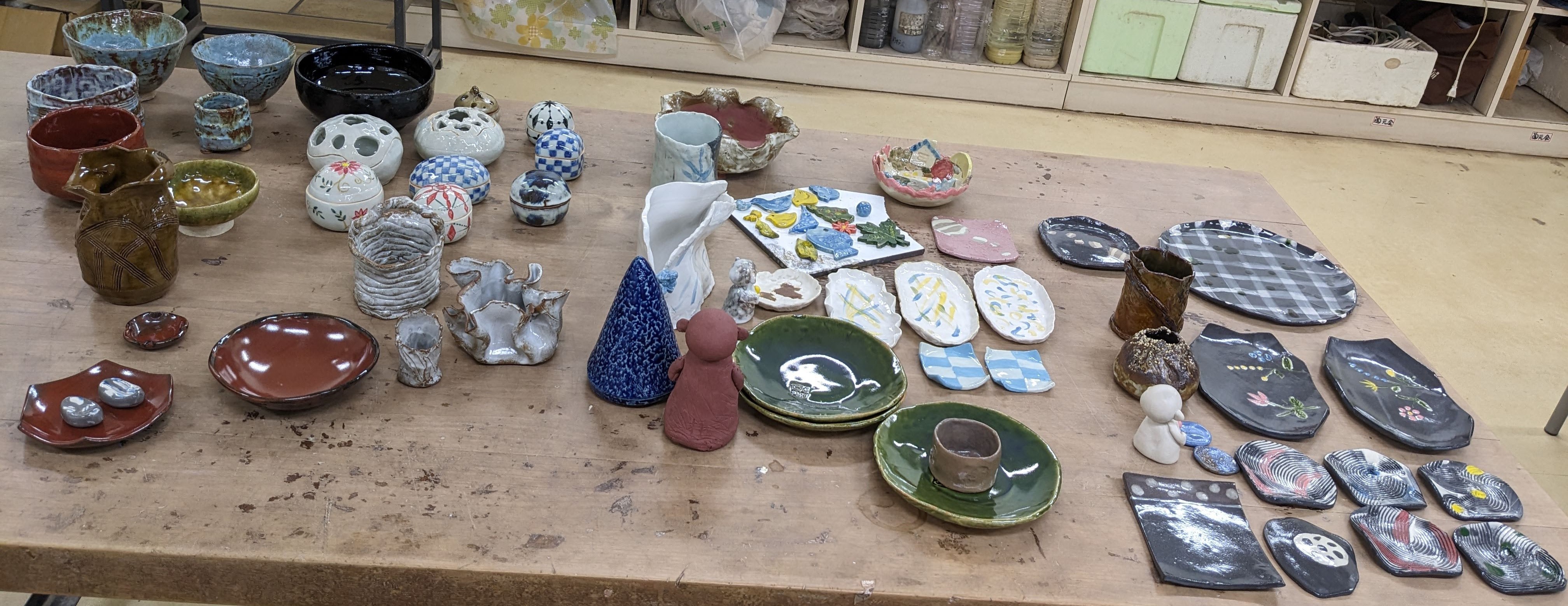 10月の本焼きが終わり品評会が 有りました。 磁土や黒泥、越前の粗め土などを使い個性豊かな作品が出来上がりました。