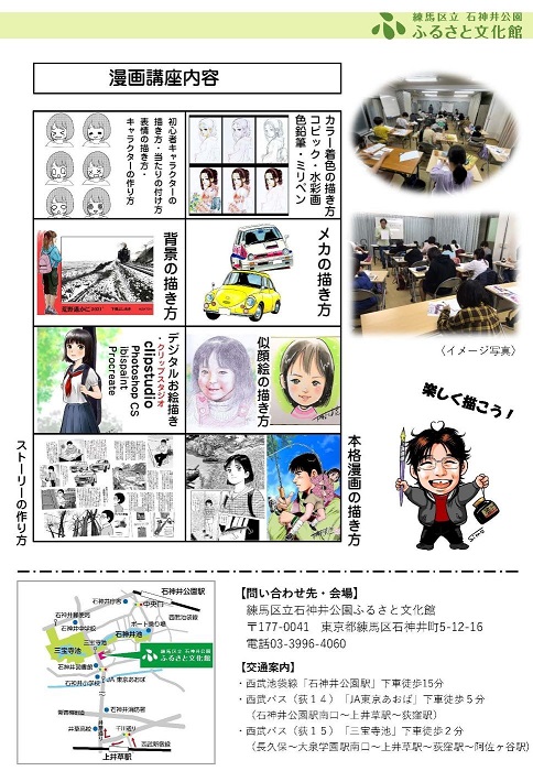 | 内容 | キャラクター作りの基本から色鉛筆やコピックを使用したカラー着色の描き方など、プロの漫画家が直接指導します。 講 師: 下條よしあき、近藤たかし (漫画家) 詳細はURL参照 |