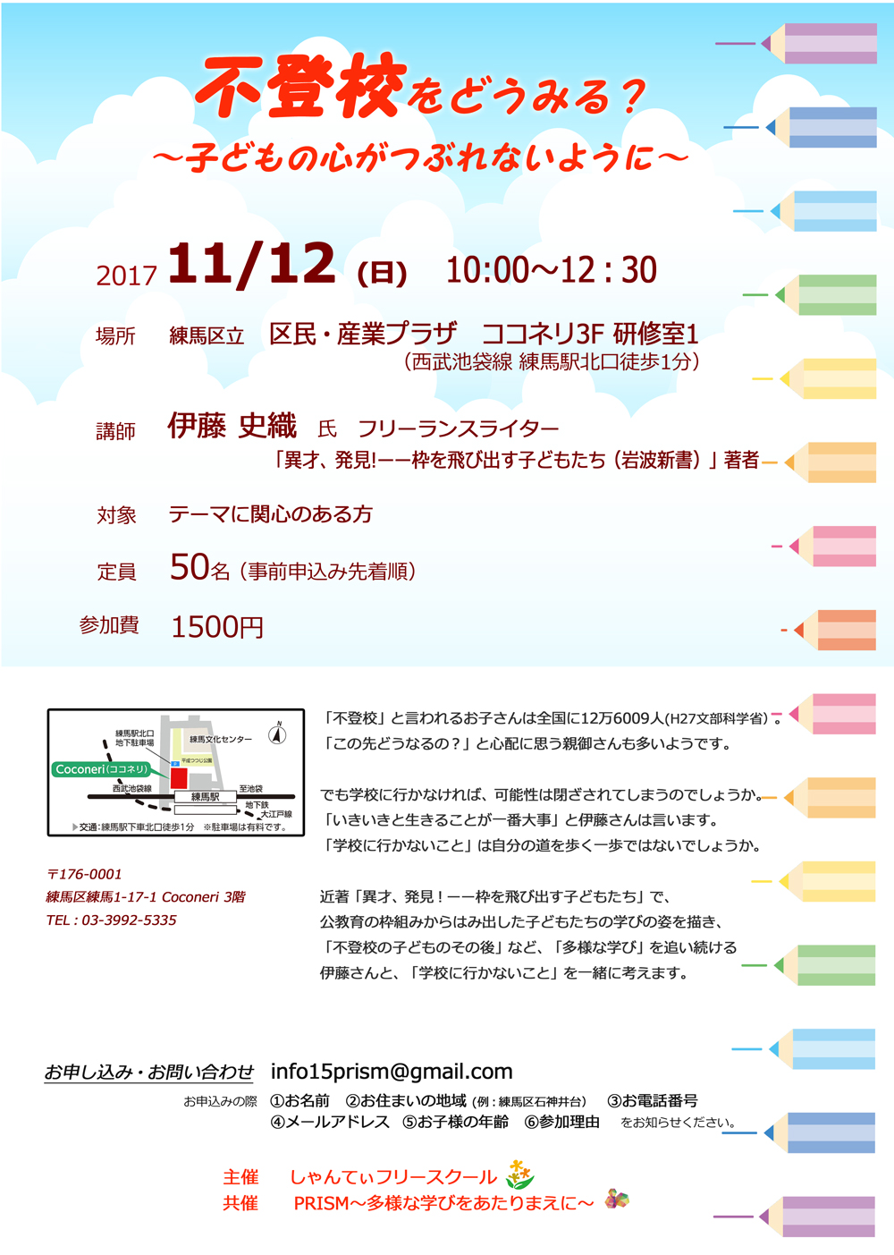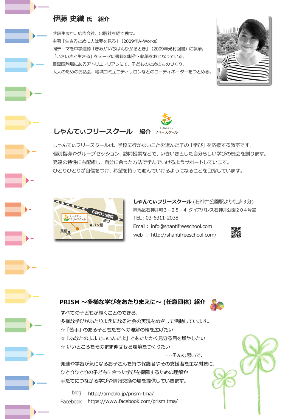 | 申込詳細 | ①お名前②お住まいの地域(例:練馬区石神井台)③お電話番号④メールアドレス⑤お子様の年齢⑥参加理由 をご記入の上、info15prism@gmail.com までお申込み下さい。 |