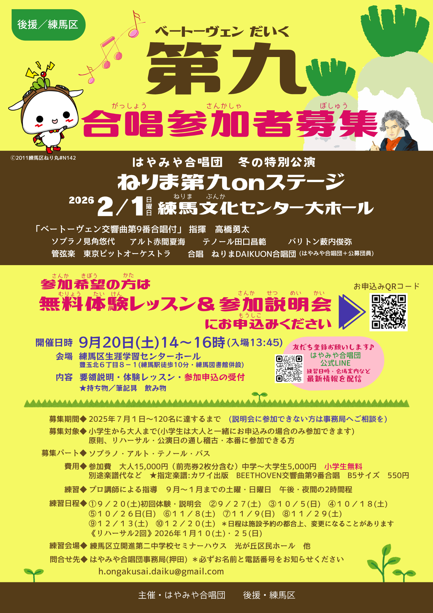 冬の特別公演「ねりま第九onステージ」に参加する合唱メンバーを募集中です。9/20に無料体験レッスン&募集説明会(事前申込制)を開催。「歌えるかな?」「歌いたい!」と思ったら是非ご参加を!!初めての方も大歓迎です。(定員になり次第、受付終了となります)