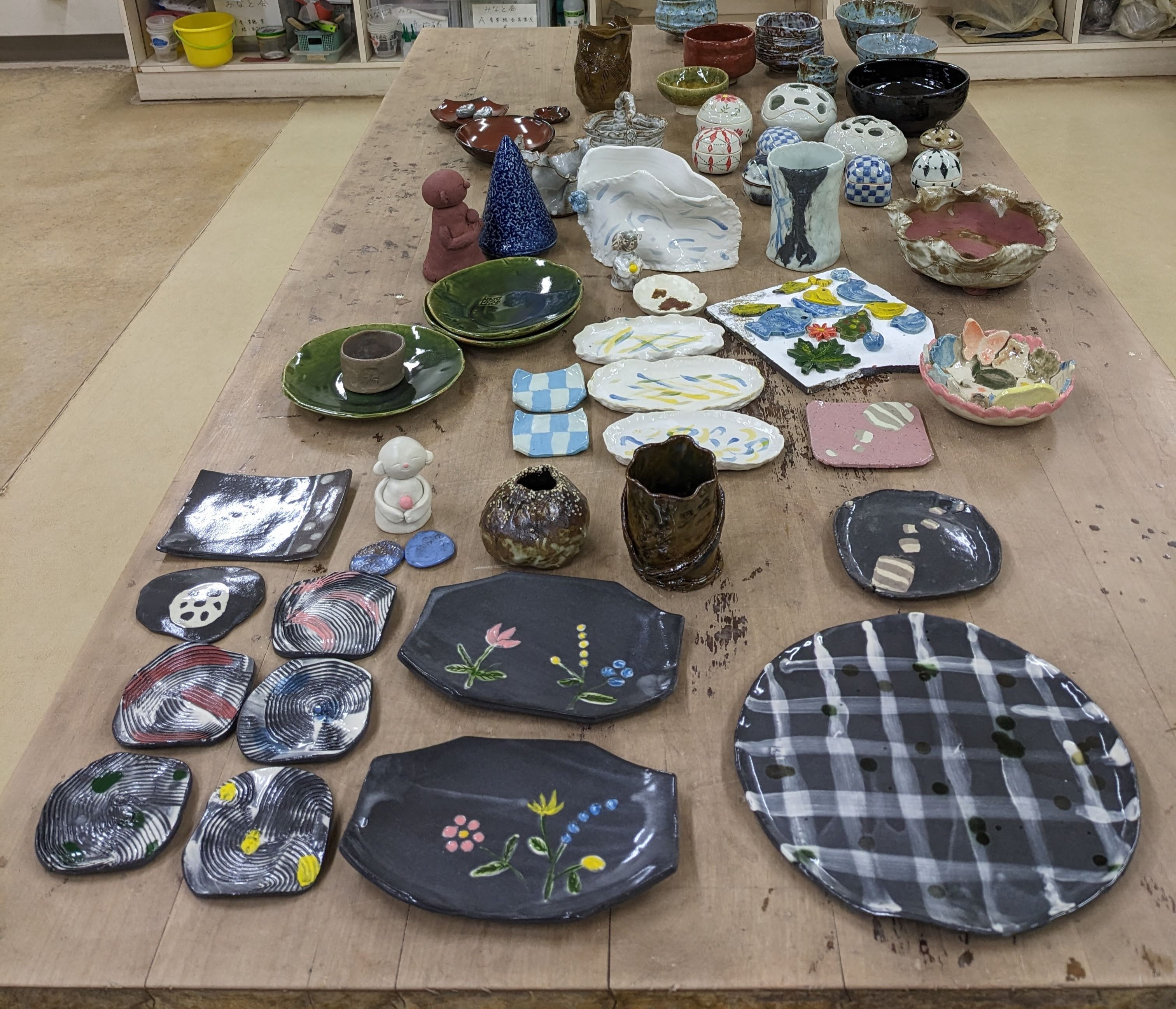 10月の本焼きが終わり品評会が 有りました。 磁土や黒泥、越前の粗め土などを使い個性豊かな作品が出来上がりました。