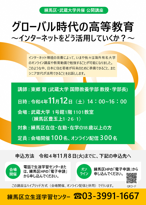| 申込詳細 | 会場開催:電話で生涯学習センター(03-3991-1667)または、 練馬区HPの「電子申請」から申し込んでください。 オンライン配信:練馬区HPの「電子申請」から申し込んでください。 |