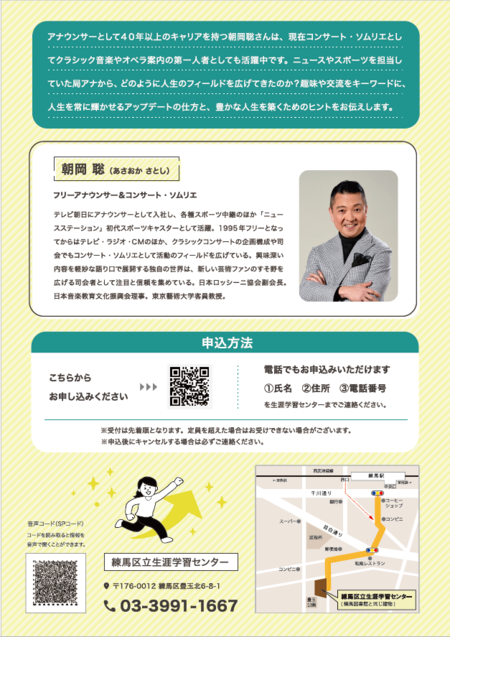 | 内容 | フリーアナウンサーの朝岡聡さんをお招きし、趣味や交流の大切さについてお話をいただきます。ニュースやスポーツを担当していた局アナから、どのように人生のフィールドを広げてきたのか、趣味や交流をキーワードにご紹介します。 講演後には、生涯学習センター等で活動しているサークルの見学ができるオープンキャンパスも開催します。あなたにぴったりの趣味を見つけてみませんか?「ねり丸グッズ」等をプレゼントするスタンプラリーも開催します。 |