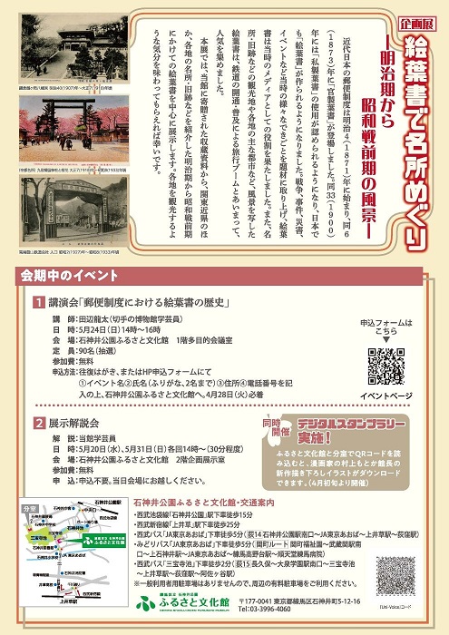 | 内容 | 本展では、石神井公園ふるさと文化館に寄贈された収蔵資料から、関東近県のほか、各地の名所・旧跡などを紹介した明治期から昭和戦前期にかけての絵葉書を中心に展示します。 ■会期中のイベント■ A 講演会「郵便制度における絵葉書の歴史」 B 展示解説会 詳細はURL参照 |